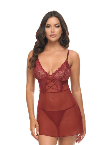 Effortlessly seductive and beautifully feminine, the Avery Faux Lace-Up Lace Top Babydoll is designed to captivate. This A-line mesh and lace babydoll features soft cups and a flirty strappy front detail that teases with every movement. The sheer, flowy skirt drapes gracefully over your curves for a romantic yet daring silhouette, while adjustable straps ensure the perfect fit.