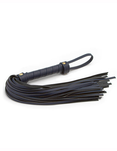 This Flogger by Bondage Couture feels heavy and exquisite.  It is 22.6 inches long and 1.54 inches wide.  It is made of vegan leather with gold colored hardware.  It has an easy to grip handle with a loop for storing or extra support for handling the flogger.  The tails are plenty and makes each delivered blow heavy and thrilling.  Run the flogger's tails across the back, stomach, and over the thighs. Your submissive will be begging for more.