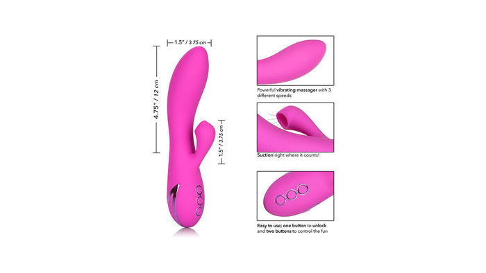 The Malibu Minx by California Dreaming is a clitoral suction, dual-stimulating vibrator. Its bulbous head and curved design sits up against the G-spot, while its clitoral piece suckles the clitoris. The Malibu Minx is made of silicone material. It is USB rechargeable and 100% waterproof. This vibrator is 8.25 inches long, 1.5 inches wide, and has 4.75 inches of insertable length.
