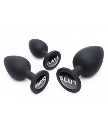 The Dirty Words Anal Plug Set by Master Series comes with 3 graduated sized plugs. The plug sizes are 2.9 inches long and 1 inch wide, 3.3 inches long and 1.4 inches wide, and 3.8 inches long and 1.7 inches wide. They are made of smooth silicone material with ABS plastic. It has a tapered tip with narrow neck. The plug tops say Slut, Whore, and Slave. This set is perfect for beginner to intermediate users. Slowly work your way up to the larger plug. Use plenty of water based lubricant.