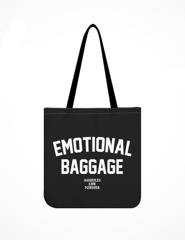 - Bold "EMOTIONAL BAGGAGE" print with signature "ASSHOLES LIVE FOREVER" logo