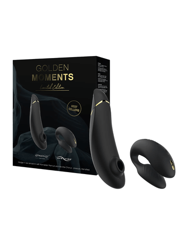 Unleash a world of thrilling possibilities with the Golden Moments Collection. An exclusive set from two industry pillars--We-Vibe and Womanizer. Genuine pleasure meets cutting-edge innovation in these two flagship products, each designed with a lustrous matte black finish and luxurious gold accents. Inside you'll find the Womenizer Premium and We-Vibe Chorus, delivering the same exceptional performance you know and love. Take the plunge into a high-stakes adventure and experience the ultimate fusion of pleasure and technology!