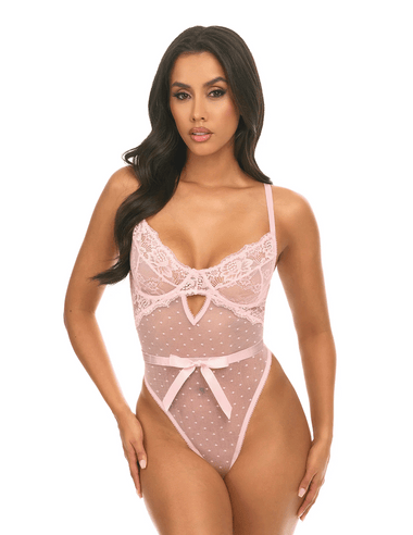 Turn up the heat with the Josie Bow Lace Teddy, where flirtation meets seduction in a dreamy, delicate design. Crafted from soft pink tulle and sheer lace, this teddy caresses your curves with a tantalizing touch. Unlined underwire cups lift and shape, while the adjustable straps ensure a fit that’s as comfortable as it is captivating. The playful waist bow adds a flirtatious finish, perfectly paired with a matching G-string for an ensemble that radiates confidence and allure. Whether it's a special night or just because, this teddy guarantees all eyes on you. Unveil your inner siren and let the night unfold.