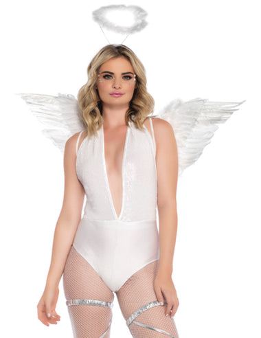 This 2pc angel accessory kit comes with a marabou halo and a pair of wings. The wings have elastic straps and are a one size fits most.