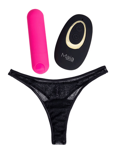 Turn up the heat on date night with the Maia Date Night Panty Vibe brought to you by MAIA. Combining style and sensation, this set includes a Magic Silk thong with a custom pocket for the powerful Jessi Bullet vibrator, ensuring comfort and excitement wherever the night takes you. The Magic Silk thong is made from a soft, stretchy blend of 83% Nylon and 17% Spandex, offering a flattering fit in sizes S/M and L/XL. Paired with the Jessi Bullet, featuring 10 vibration functions and a remote control that works up to 15 feet away, it’s the ultimate blend of fashion and fun.