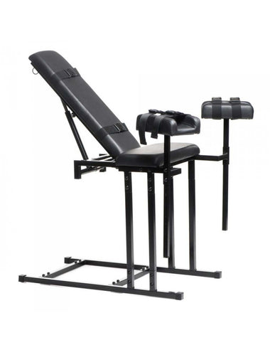 Meet the Extreme Obedience Chair by Master Series and open up to the many different possibilities for any position, discipline, and angle you can think of. It is made up of a sturdy metal frame with iron and wood, and with a weight threshold of 440lbs it can support partners of many sizes.