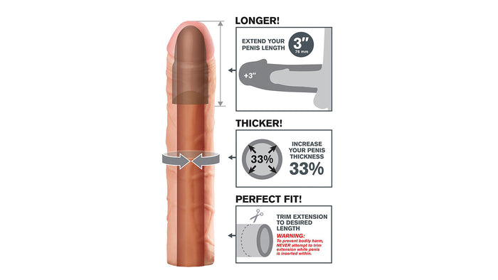 This extension gives all penises or dildos an extra 3 inches in length and enhances girth by 33%. Crafted of realistic and flexible Fanta-Flesh material, it warms to your body temperature as you use it. Thrill your lover with its thick head, ribbed and veined textures, and its extra mass. Trim the end of the extension sleeve for a perfect fit. Use with water based lubricant for the best glide.