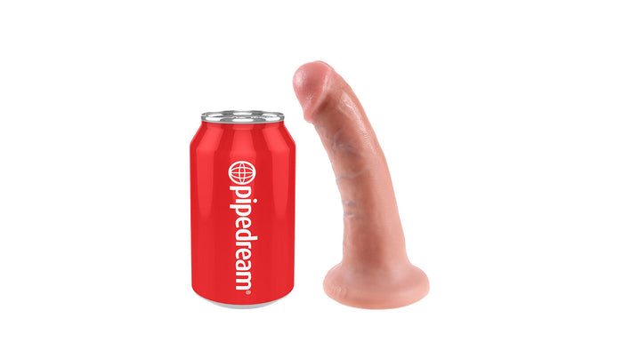 This 6 inch Realistic Dildo by King Cock is a girthy member made to give you the fill you crave! It is 6 inches long and 1.6 inches wide. It is made of flexible PVC material. Designed with a thick, prominent head and textured shaft, this dildo will easily be your favorite dildo to play with. Use plenty of water based lubricant. Its flared base allows the toy to be harness compatible and can be stuck on any smooth solid surface for a hands free, thrusting experience.