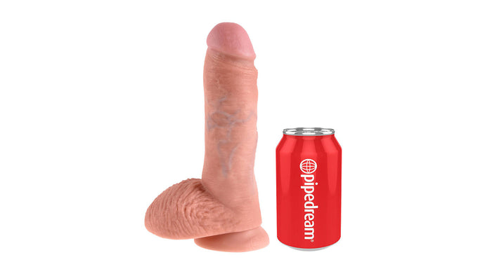 The 8 inch Cock with Balls by King Cock is a girthy beast! It has a girth width of 2 inches with 5.75 inches of insertable length. It is made of a firm but flexible PVC plastic material. The shaft is covered with faint textured veins. The base has a strong suction cup behind the balls. For best suction, place the suction cup against an even leveled, non-porous surface area. This dildo is also harness compatible with an O-ring bigger than 2 inches wide.