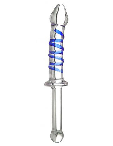 The Nyasa Thrusting Wand is double the pleasure. It is a total of 10 inches long. The longer end is 5.25 inches long and 1.45 inches wide. The shorter end is 4.25 inches long and 1 inch wide. It is made of borosilicate glass, a type of glass that withstands against extreme temperatures and won't expand and shatter like normal glass. The longer end has a tapered tip and texture that swirls down the shaft. When inserted, the ribbing of the swirls adds texture and massages the vaginal or anal inner walls. The shorter smaller end is great as an anal probe. Tease and please your partner with this end to explore the sensations of anal play. The short end can also be used as a handle to thrust its longer shaft into a lover. This toy is compatible with all lubricants. It is non-porous and very hygienic. Wash it with toy cleaner in warm water or boil for up to 3 minutes to fully sanitize.