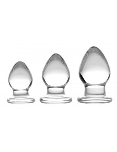 Glass is the best material to train your anal sphincter. The Triplets Anal Plug Kit by Prisms Erotic Glass have 3 levels of anal plugs. The small plug is 2.25 inches long with 1.75 inches of insertable length and 1.25 inches wide. The medium plug is 2.75 inches long with 2.25 inches of insertable length and 1.75 inches long. The large plug is 3 inches long with 2.5 inches of insertable length and 1.8 inches wide. These plugs are a smooth way to transition from the small plug to the large plug. Add your favorite lubricant and gently push the tapered tip back and forth against the anal sphincter. As the sphincter relaxes, push a little more of the plug in. Gradually your back door will relax and you will graduate to the last plug. Glass is non-porous and very hygienic. Wash it with toy cleaner in warm water or boil it for up to 3 minutes to fully sterilize these plugs.