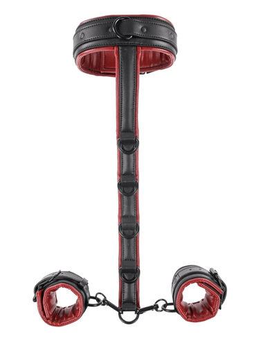Meet the Neck & Wrist Restraint by Saffron, the innovative answer to a submissive who insists on wiggling around. This 3 piece kit is made of vegan PU leather and includes a wide collar attached to a sturdy spine with multiple D rings as well as a set of adjustable wrist cuffs. For maximum comfort and length of wear, all parts of this set are lightly padded, and can be used in addition to any other BDSM accessories you have. Positioned in the front or back, the possible angles are countless when your submissive becomes their own restraint system! Buckle up!