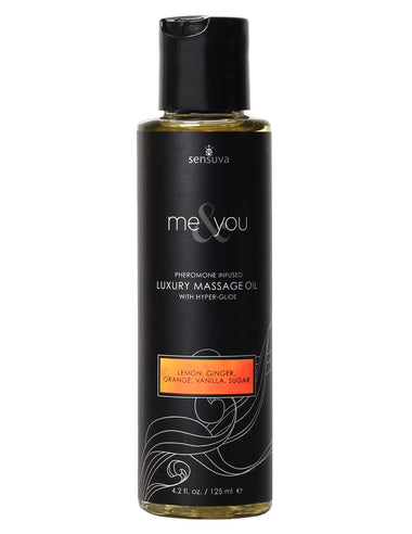 Me & You Massage oils by Sensuva will invigorate your senses as you relax. These are luxury oils infused with Pheromones, Vitamin E, and natural Essential Oil blends. Citrus will wake you up,. Scents of vanilla and sweet pea will calm you. Plumeria, fig, and coconut will tickle your senses and take you on a tropical retreat. This blend of natural oils will make your skin soft. As the oils heat up on your skin, pheromones will trigger your partner's and your sexual urges. A massage between lovers is a very intimate moment. Heat things up in the bedroom with Sensuva Me & You Massage Oil.