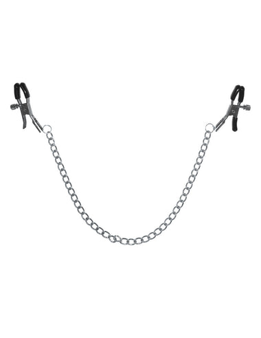 Titillate your senses with Chained Nipple Clamps by Sex & Mischief. Come on, admit it. You love nipple play so much that you're more than just a bit curious about using something harder. These nipple chains are fully adjustable. Adjust them to the perfect amount of pressure to your liking. These clamps have rubber tips for an even distribution of tension. It has a 13 inch, nickel free, chain. Tugging at the chain, while the clamps are around the nipples, adds pleasurable sensations. Wear them out or in the bedroom.