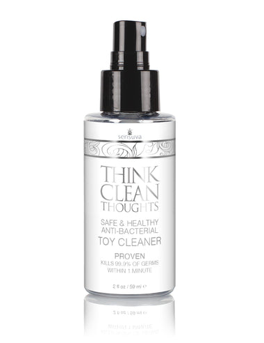 Keep your toys clean with Think Clean Thoughts by Sensuva. This anti-bacterial toy cleaning spray is enhanced with Witch Hazel. It leaves toys clean with a light scent of sweet orange. This toy cleaner is made with all natural ingredients.